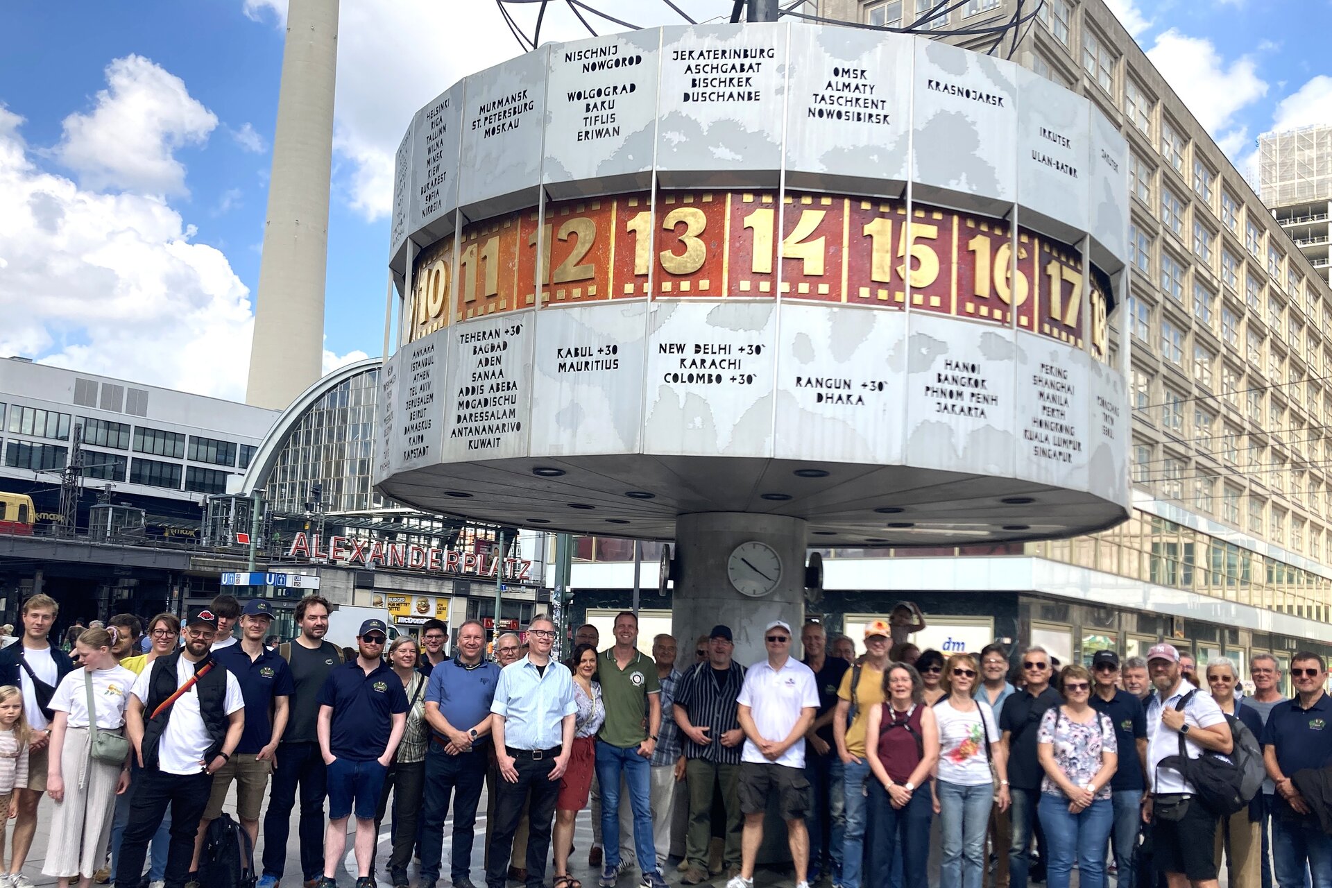 Die Teilnehmer vor der Weltzeituhr Alexanderplatz